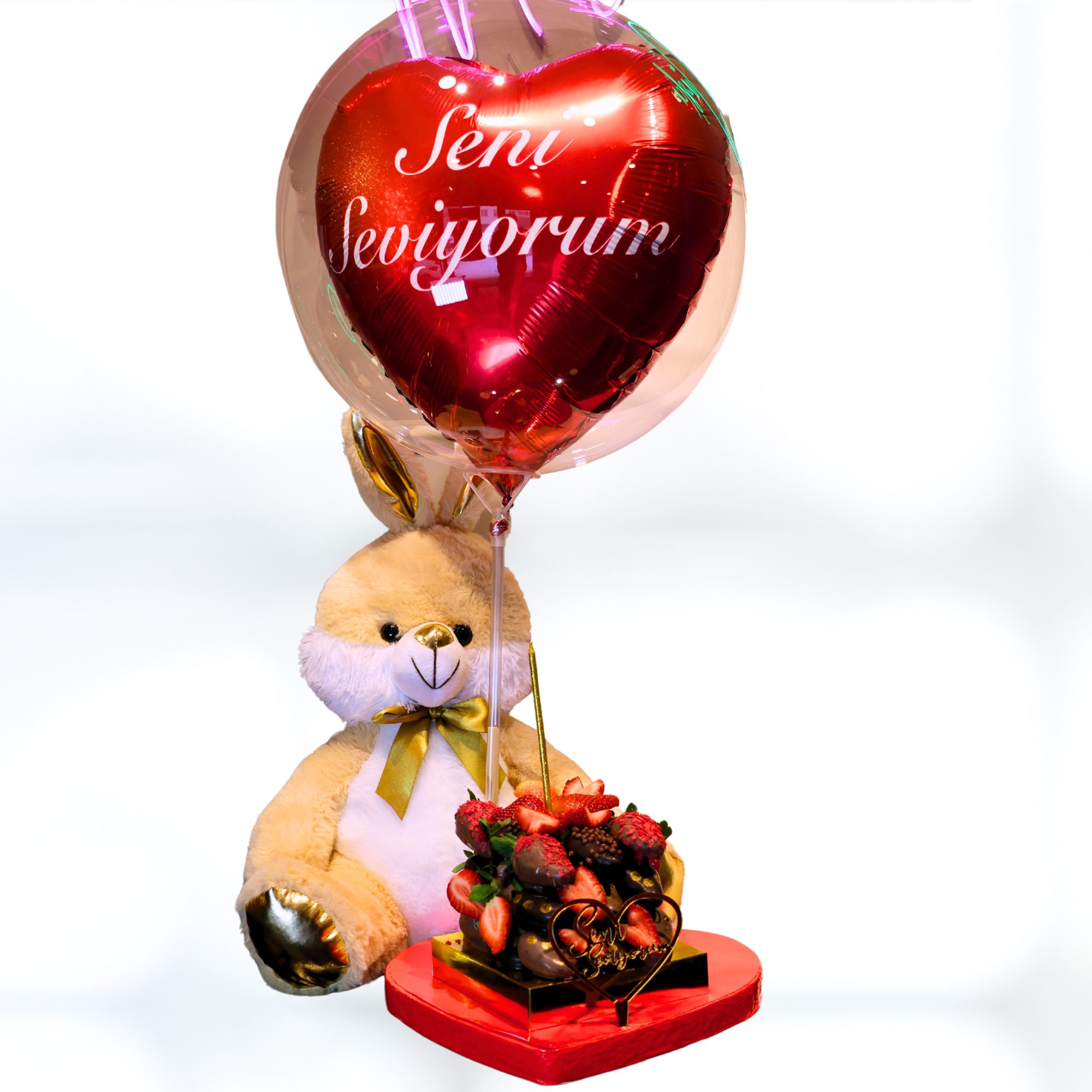 Sevgililer günü için tasarlanmış özel ürünümüzde içerisinde tavşan ve balon dahil. ful çikolatalı çileklerden oluşuyor