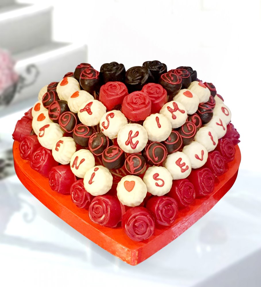 Ürünümüzde yaklaşık olarak 22 adet çikolatalı gül kek, 20 adet üzeri yazılı beyaz çikolatalı kurabiye, 20 adet bitter çikolatalı truffle, 3 adet çikolatalı gül kek bulunmaktadır.