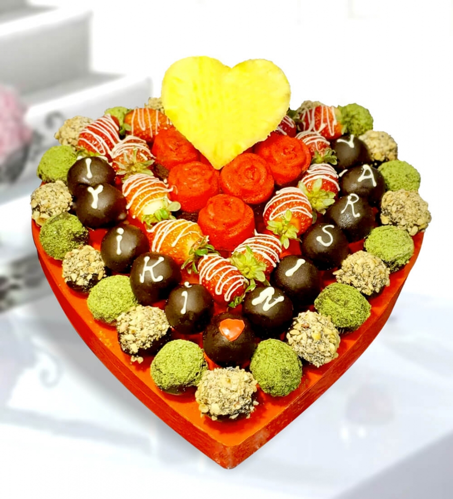 Ürünümüzde yaklaşık olarak, 22 adet fındıklı fıstıklı truffle, 10 adet bitter çikolatalı truffle, 12 adet çikolata çizimli çilek, 3 adet gül kek, bir kalp ananas dilimi bulunmaktadır.