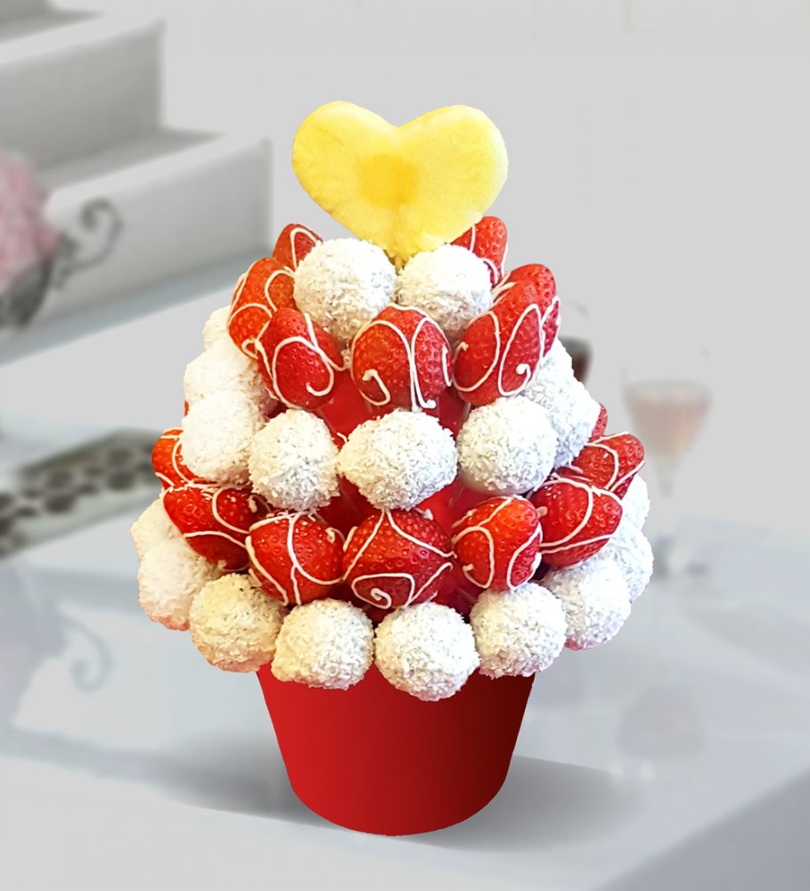 Ürünümüzde yaklaşık olarak 25 adet hindistan cevizli çikolatalı trufflar, 20 adet çikolata çizimli çilekler ve mesaj yazabildiğimiz kalp anans dilimi bulunmaktadır.