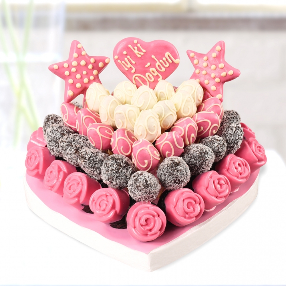 Ürünümüzde yaklaşık olarak, 16 adet frambuaz çikolata kaplı kek gül, 19 adet bitter çikolata ve hindistan cevizi kaplı çilek, 24 adet çikolata kaplı işlemeli truffle, 3 adet kurabiye bulunmaktadır.